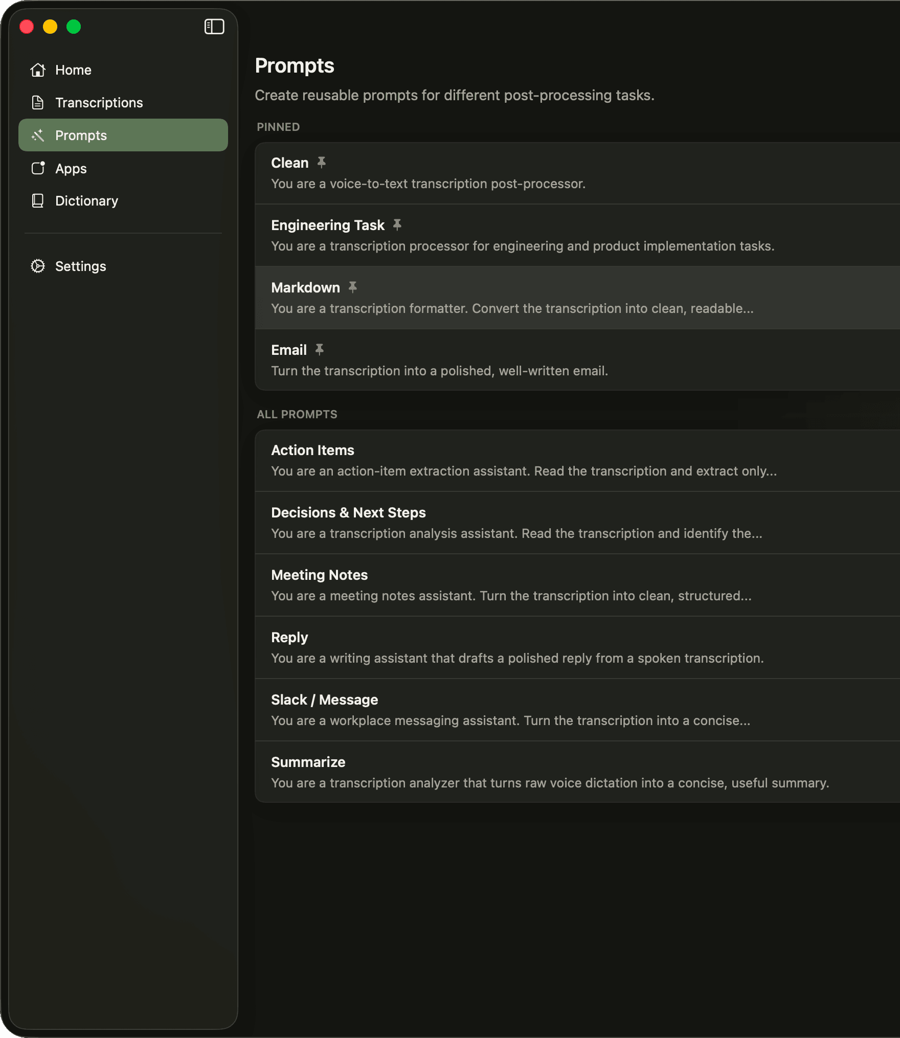 Post-processing, convenient shortcuts, and history designed to make voice a natural part of how you work.